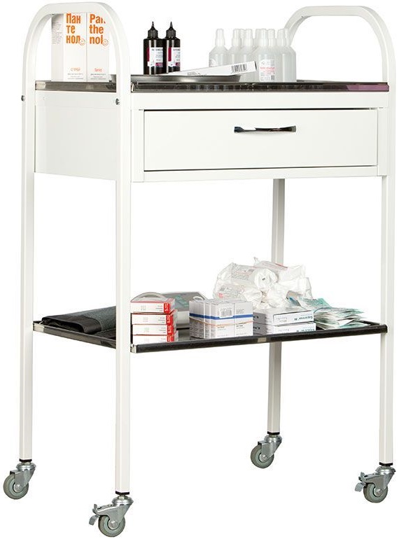 - Полки и выдвижной ящик образуют три уровня хранения. Выполнены методом «прессовой вытяжки» из высокопрочной нержавеющей стали 1 мм, устойчивой к возникновению трещин и сколов, а также к обработке дезинфицирующими средствами.